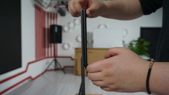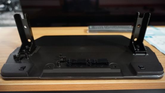 上图可以看到电视整体呈现倒T型,下图为底座细节实拍,其实底座只有很小一部分,从远处看,底座几乎不可见,这样的设计给人第一印象十分不错。
