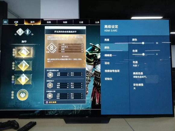 在选择电视的“游戏”模式后,在“颜色”选项里,有一个“高级设定”,在高级设定下有色温的选择,大家注意里面默认的“专家1”模式,说明A8F在出厂前,默认设置中已经为大家预设了非常精准的色彩模式了。
