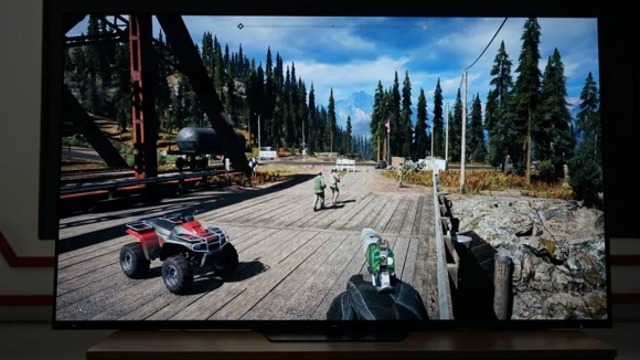 我们还试了试育碧的《孤岛惊魂5》,在效果全开的状态下,天空中云层的表现十分自然,《孤岛惊魂5》在植物以及水的细节表现令人满意。在天空向下急速滑行时不会出现低端电视会有那种模糊拖延感,因为《孤岛惊魂5》是一款FPS游戏,作为主体的枪械和载具能在高速下落中保持很高的清晰度,让画面主谓分明,能给玩家非常的好指向性和方位感。