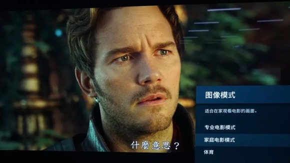 在播放电影的时候有两种模式可选,专业电影模式和家庭电影模式,专业电影模式特别针对适合胶片内容的画面,追求对电影画面的最高还原度,适合在暗室环境开启,家庭电影模式则对电影画面进行了更多的声光渲染,即便是在明亮环境下也可以得到影院级的体验,对待4K HDR片源时,我们发现采用专业电影模式可以获得更为逼真的画面效果,下面是我们用测试碟4K版《银河护卫队2》蓝光碟进行试机时的实拍画面。