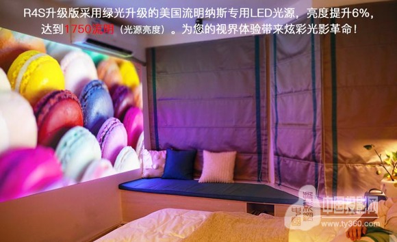 酷乐视R4S升级版在R4S的基础上,对LED光源再度提升,采用绿光升级的美国流明纳斯专用LED光源,亮度提升6%,达到1750流明光源亮度,为您的视界体验带来炫彩光影革命。