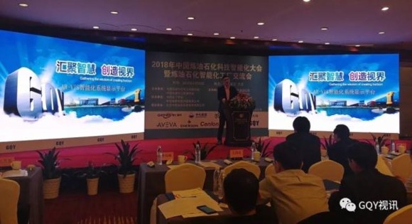 GQY营销部副总经理王坚军也上台发言,表示赞同三位院士的观点,并作了《AR-VIS智能化显示平台》的报告,阐述了GQY的AR-VIS可视化解决方案如何应用于石化生产中,如何帮助提高石化企业的智能化水平。