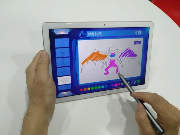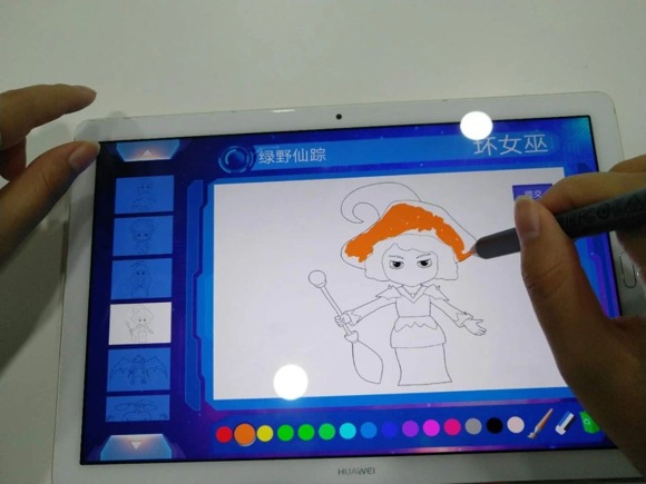 在儿童体验区,家长和小朋友们坐在一起,拿着华为PAD给选好的角色涂色。他们尽情发挥想象力,用多彩的颜色让自己的图案与众不同。不一会儿功夫,桃乐丝、铁皮人、小狮子等故事人物就色彩艳丽地出现屏幕上。