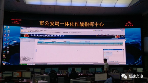本项目中,联建光电为客户提供了整体的LED大屏幕指挥监控信息显示解决方案,可全屏或分屏显示监控点的实时图像或历史录像,可随时调入GIS画面,将大量信息、高数据流及多路监控灵活方便的展现在大屏上,实现对辖区动态的实时掌控。