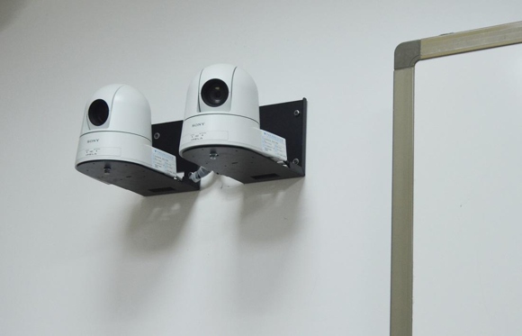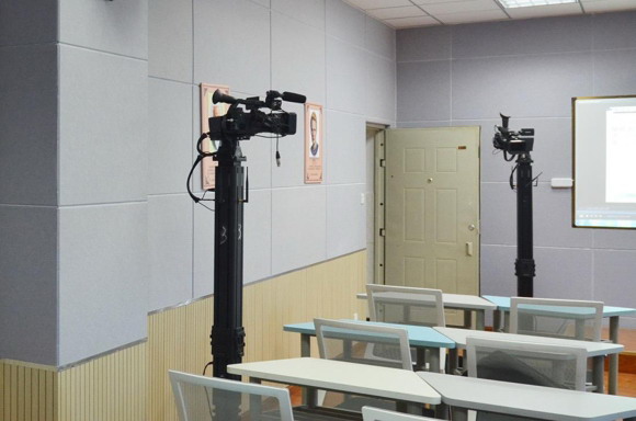 另一个教室是全自动录播系统教室,配备了索尼LRS-1全自动录播系统,教室前、后分别安装了两组共4台云台摄像机,拍摄角度全面覆盖,老师可以随时轻松切换视角与远景/近景。