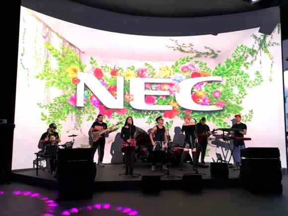 走进展厅,观众即刻会被鸿合与NEC携手打造的绚丽影像与劲爆舞美所吸引!鸿合展位成为全场焦点,在NEC PH3501QL+创造的4K全息投影沉浸式舞台上,来自加拿大的摇滚乐队奉献超燃Live Show!
