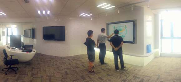 走进山东新旧动能转换创新中心,科技质感与简约风格令人眼前一亮,7台鸿合商用交互平板中优雅伫立,创造现代化展厅空间。其中3台ICB-N75P并排放置,形成一个三屏联动展示方案,讲解PPT、播放视频以及各类文档可同时进行,画面整体感更强。