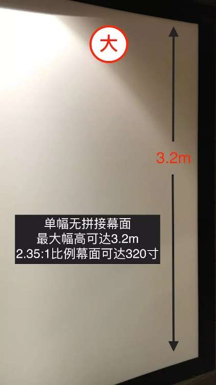 大尺寸:单幅无拼接幕面,最大幅高可达3.2m,2.35:1比例尺寸可达320寸;