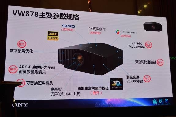 2018年9月14日, 在广州国际音响唱片展盛大开幕之日, 索尼正式向中国市场重磅发布一款家用投影机新品 – 激光4K HDR家庭影院投影机VPL-VW878。新机结合了先进的激光光源与索尼的4K SXRD面板技术,配备多种新功能,将进一步提升用户的沉浸式观感。