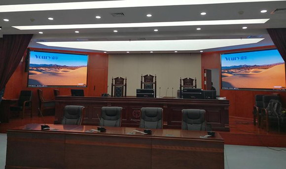 青岛市中级人民法院新建成的审判法庭一楼科技法庭内,市中院科技法庭正式投入使用。该项目采用Voury卓华ZHVW-150微间距LED大屏幕拼接而成,依赖于微间距LED显示屏高对比度高刷新率的特性,使得显示画面更加图像流畅,清晰,提升了法院刑事开庭的硬件水平。