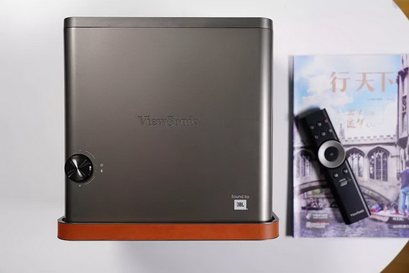 简洁的顶部只有正中间“ViewSonic”的英文logo以及右下角JBL的logo,显而易见,优派X10-4K的高品质音箱来自JBL。而左下角偏上一点是一枚可以旋转的带着同心圆纹理实体按钮,这颗按钮起着电源键和音量键的作用,同时边上还有两颗指示灯,显示着投影仪和蓝牙音箱两种工作模式。