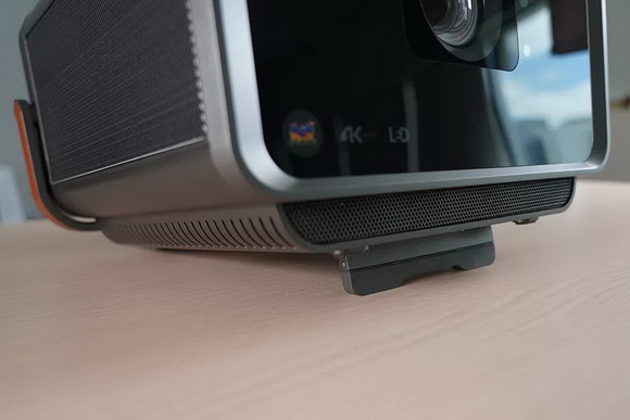 优派X10的底面配备了3个M4X8mm的螺丝安装孔,可以满足办公室或者新装修房子的悬空吊式安装,这样也极大的节省了空间。四个防滑胶垫也保证了放在桌面时不容易移动,从而导致投影画面偏移。并且底部还有一个两段式垫脚结构,可以根据实际投影情况来调节角度。