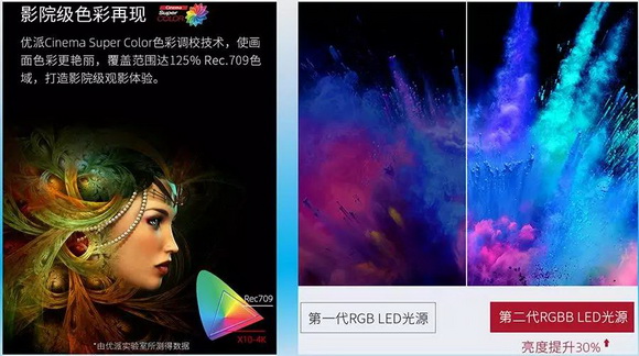 我想音效和画面能做到这样的效果,和它背后搭载的众多功能息息相关。例如JBL的360°环绕立体声、金耳朵实验室的专业调校,还有比第一代亮度提升30%的RGBB第二代LED光源,Cinema Super Color的色彩调教技术、18%红光占比还原自然肤色等等一系列的技术。