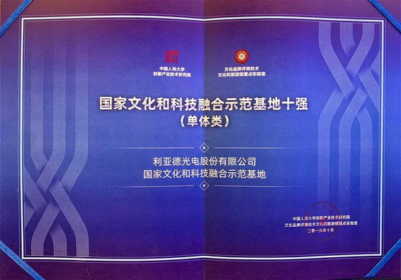2019年10月25日,中国人民大学创意产业技术研究院、文化品牌评测技术文化和旅游部重点实验室在2019中国(南京)文化和科技融合成果展览交易会上发布了“国家文化和科技融合示范基地十强榜单”。此次,利亚德光电股份有限公司成功入围单体类基地十强并排名榜首,成为业界典范。