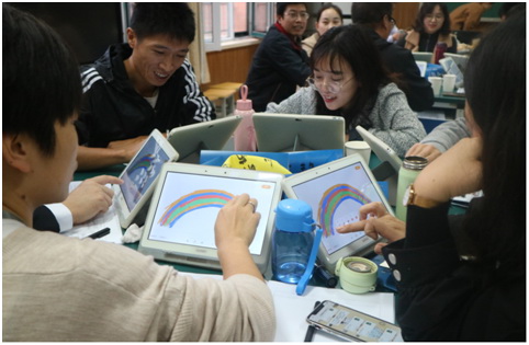 随后,她在场的教师们下发了小组协作任务,以画彩虹的方式体验希沃易课堂功能。画作展示过程中笑声不断,她在最后总结到:“假如学生也能在这种轻松的氛围中共同完成小组协作任务,不仅效率高,还能锻炼学生的合作意识。”