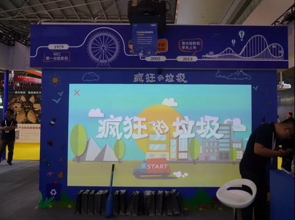 在NEC 1万流明4K激光工程投影机PX1005QL打造的“垃圾分类”展项,观众不仅可以学习垃圾分类常识,还能“通关”赢取精美礼品。其搭配的全新0.37反射式超短焦镜头,更短距离可实现更大画面,为狭小空间的应用提供了灵活的投影解决方案。