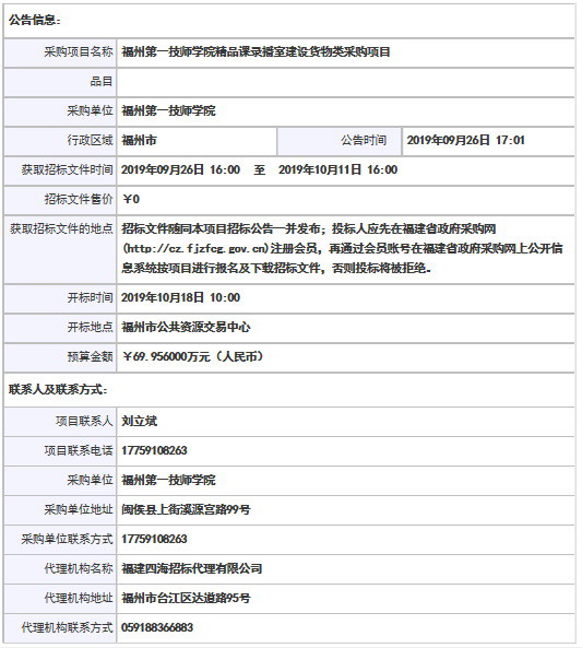 福州第一技师学院精品课录播室建设货物类采购项目招标公告