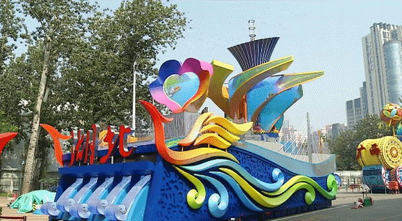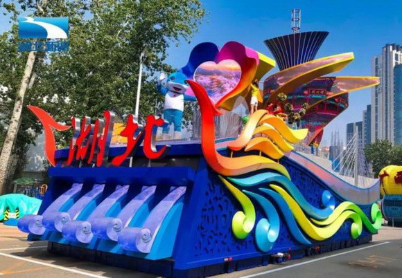“湖北彩车”呈楚凤凰造型,身长15米,高10米,宽6米,体重30吨。彩车前部的心形显示屏,意为两江交汇;左右两侧装有曲面显示屏,展示湖北景观;车体7米多高处六片巨大的花瓣也是显示屏,迎风张开;顶端一朵马蹄莲,象征着中部崛起。彩车驶过天安门广场,虽只短短几分钟,其中却凝聚了制作者们和各方人士的汗水和心血。