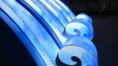 “湖北彩车”车头以三峡大坝为造型,坝前的五朵浪花,由美亚迪户外P3柔性异形显示屏完美呈现。三面异形屏无缝拼接,从画板到定型本身就是一个挑战,多款异形屏加大了设计难度,对制作生产工艺要求也很高,同时兼具防水防震和前维护的技术要求。