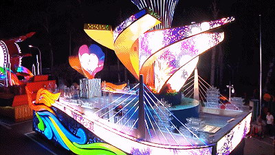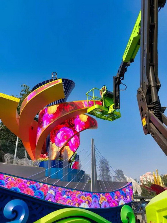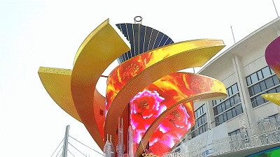 彩车中的六片花瓣,采用的是美亚迪户外P3柔性异形花瓣屏,每片重达1吨,细长的曲面形,伸开在7米多处的高空,因为在空中平衡的不好把握,易侧翻,也加大了安装的难度,工程人员反复开会论证,重新改造花瓣结构,先把六片花瓣组装好,最后再整体吊装上去。