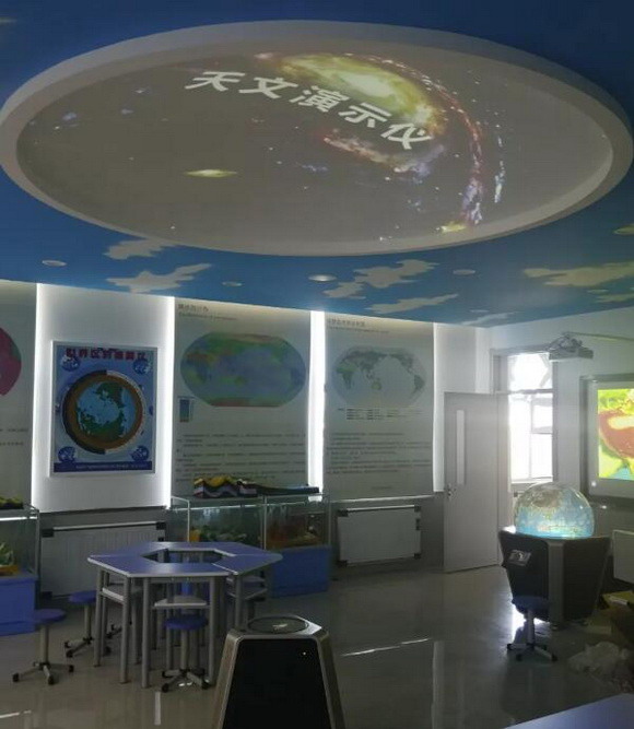天文演示仪在天花板上投影出一个圆形的演示穹顶。将学生的视角由地球范畴,转向太空乃至整个宇宙,将地理知识与天文教学有效整合,使学生了解地月系、地球与太阳系、地球与银河系之间的关系,了解恒星、行星的形成及宇宙的演变过程。