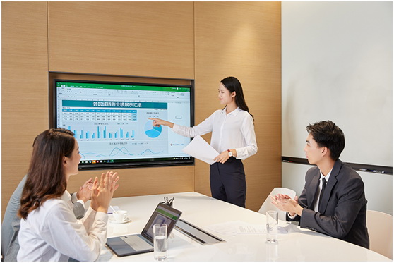 中盈地产的智慧办公空间注重多元化与个性化,建有现代化开放式讨论区,在这里,newline会议平板将科技感与时尚感融为一体,让办公区域空间具备灵活可塑的功能性,实现了高效率沟通协作。