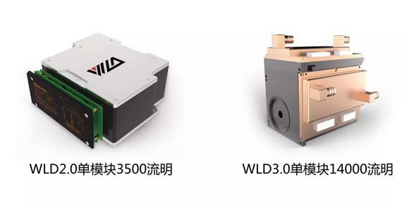 镭创高科最新推出的60000流明高亮度光源,采用WLD3.0白光激光技术,实现了高亮度、低散斑、低能耗等诸多优点。相当于7台华为手机的WLD3.0和WLD2.0模块大小相当,但是亮度提升了4倍,所以整机体积大幅度减小,可以使用原来氙灯的空间,完美地实现了内置一体化。