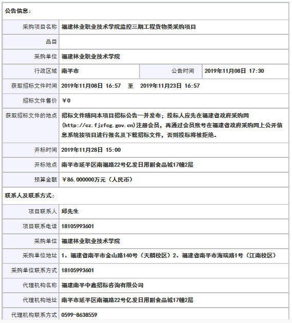 福建林业职业技术学院监控三期工程货物类采购项目招标公告
