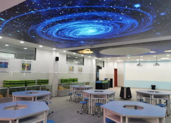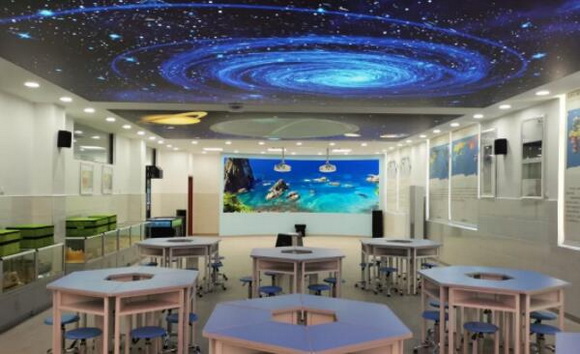 深邃的蓝色、小组学习式的课桌椅以及四周的地理知识窗帘和地形地貌模型,羿飞地理专用教室一改传统教室的设计布局,以更清新自由的形象展现在师生面前。