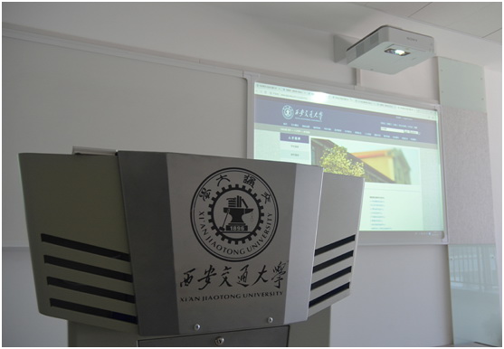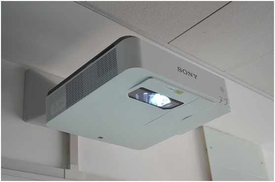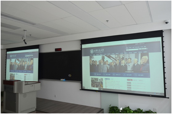 接下来到访的教室安装了两台VPL-U300WZ,在这个教室中,学生更像是围绕着讲台,与老师距离更近,适合交流、互动比较多的课程。VPL-U300WZ超短焦优势能够解决安装距离限制,支持100英寸大画面投影,而且老师站于屏幕前也不会遮挡画面,效果出色。