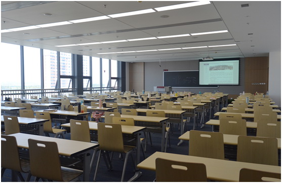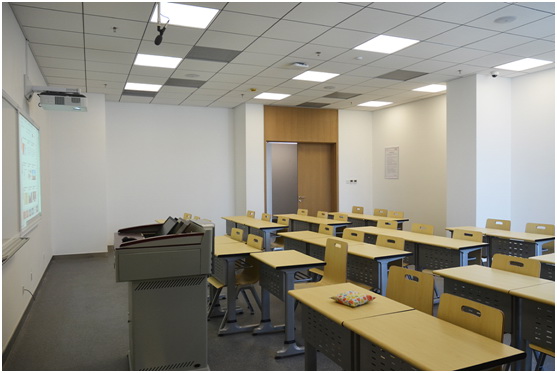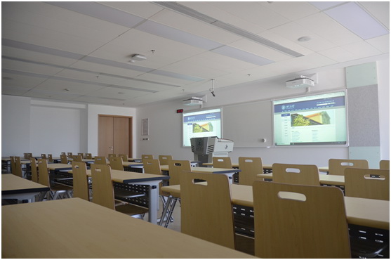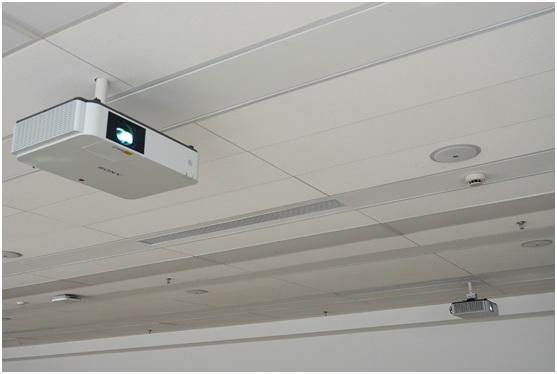 我们首先来到面积最大的授课教室,空间广阔,一侧墙壁完全是落地窗,光线充足。由于空间较大,所以配备了两台索尼VPL-P500WZ,在讲台两侧分别投影120英寸画面。即使白天阳光强烈,室内灯光亦开启时,教室两侧与后端的学生依然能看清画面。