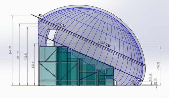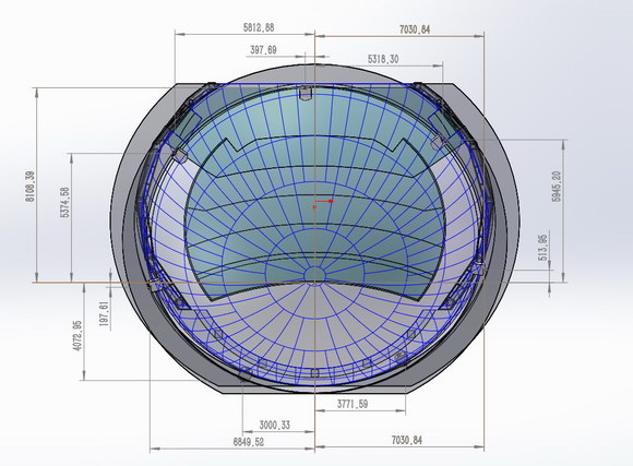 首先,为了让观众获得身临其境的感官体验,该馆通过增加球幕高度的办法来提高包裹感,剧场最前方的地面也被设计成投影的一部分,这就加大了投影设计的整体面积,同时该球幕为异形球幕,靠近座椅与地面的位置需留出通道空间,这些条件都增加了投影设计的难度。