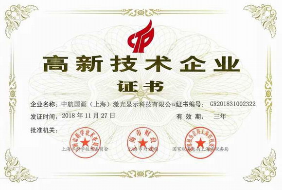 近日,中航国画喜迎佳音,根据国家《高新技术企业认定管理办法》和《高新技术企业认定管理工作指引》的相关规定,中航国画(上海)激光显示科技有限公司被认定为国家级高新技术企业,由上海市科学技术委员会、上海市财政局、国家税务总局上海市税务局联合颁发“高新技术企业”认定证书,由此正式迈入国家高新技术企业行列。