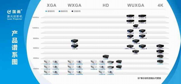 中航国画从成立至今,短短2年的时间,已经建立种类齐全的激光投影产品线,公司产品系列扩充到11个平台,40多款产品,分为军用、商教、家用、工程多个系列,目前已经在销售产品亮度从2800-16000流明,分辨率范围涵盖XGA(1024×768)到4K(3840×2160),投射比从0.233-5.5。
