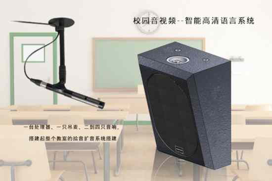 一台处理器、一只吊麦、二到四只音响,搭建起整个教室的拾音扩音系统搭建,达到老师自由讲课,学生清晰听课的理想效果。独家专利功能:终端音响可同时作为校园广播的扩声系统,设备利用最大化,避免校园广播与教学扩声的两套系统重复投资。