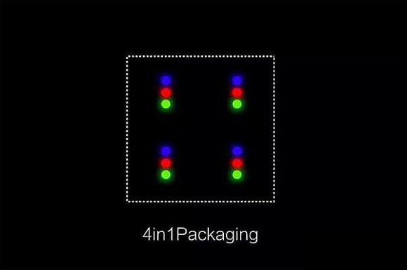 四合一mini-LED技术是指中游封装规格。传统表贴灯珠基本是一个像素点,包括红绿蓝的三个或者四个LED晶体;传统COB产品是大CELL封装,一个封装结构中少则数百、多则数千个像素点。而四合一封装结构,则可以视为传统表贴灯珠与传统COB产品之间的一种折中技术:一个封装结构中有四个基本像素结构。