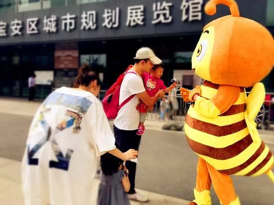 在宝安中心区图书馆北门入口,百度AI智慧科普大巴一早便停靠在侧等待市民的到来。艾比森人偶小蜜蜂则担当起了接待大使的重任,其可爱呆萌的形象,让过往市民倍感亲切,也吸引不少目光,让更多人了解并参与《鹏城有非遗》的相关活动。