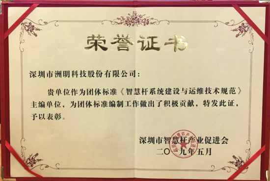 洲明凭借多年的技术研发与多方实践经验的累积,在参与标准编写的过程中做出了积极的贡献,得到了深圳市智慧杆产业促进会的表彰。