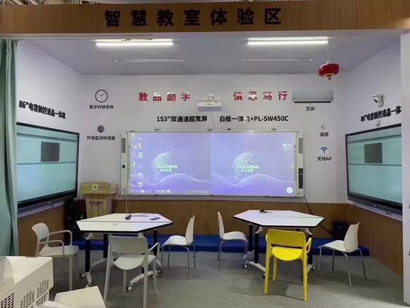 智慧教室体验区由一块主屏+两块副屏+多个智能平板组成。主屏是东方中原自主研发的153寸双通道超大尺寸白板一体机,副屏是2台86寸电容一体机。副屏(一)与主屏内容可同步显示,副屏(二)与球形摄像头和数字班牌组成一套无感考勤系统,可显示考勤信息、巡课抓取视频(终端可对接学校监控系统,调取与视频监控系统连接的摄像机的实时画面。借助此功能,有权限的人可以刷卡选择对应的教室所在楼宇、房间号和摄像头,并通过终端查看教室上课画面和学生听课状态,实现领导随时巡课的功能,一键关闭教室灯光拉上窗帘。)满满的科技感,将智慧教室演绎得淋漓尽致。