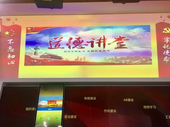 跨空间党建互动线下平台则是一面校史互动展示墙。该展项采用2台SONNOC SNP-LU8500投影机融合打造的超大画面投影,结合VIS(显示墙互动显示系统),可以在竖放的43寸触控一体上显示时间轴信息并选择要查看的视频或者图片内容通过甩动操作将感兴趣的内容发到上方的投影显示墙面上,可用于线下党建培训与互动。该展项多应用于校史馆或者博物馆互动展示等领域。