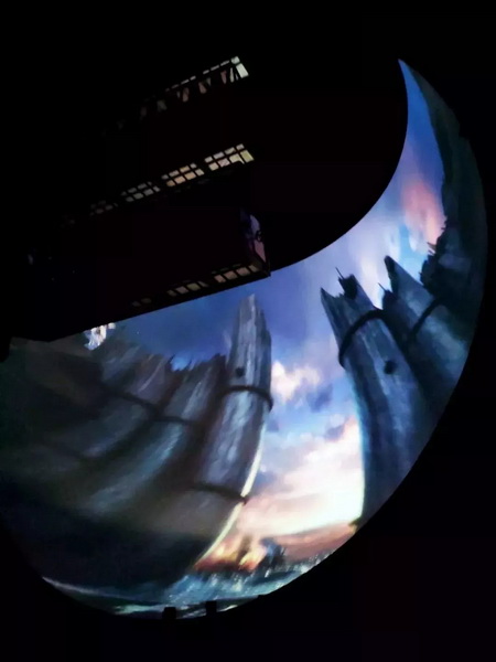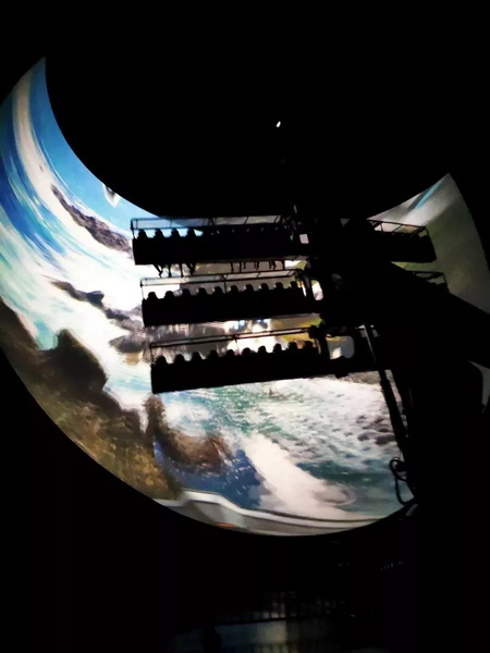 丝路探险区的“郑和宝船”外观仿造中国明代著名航海家郑和下西洋时期的巨船,在船头与船尾的仿真船舱内分别设有2套碗幕沉浸影院,通过全方位模拟电闪雷鸣、狂风骤雨下逼真的特效影像。该方案在宽达23米的幕上由1台NEC 40000LM激光工程投影机+定制鱼眼镜头投射影像,取代了之前多机位融合的方案,不仅仅能保证画面的一致性,并且省去了大量的后续维护成本,是目前大型球幕、碗幕非常理想的解决方案。