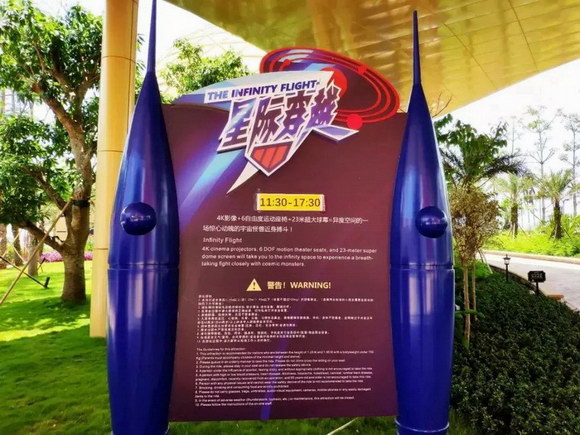 “星际穿越”是一个在超大型太空穹顶之下的太空题材特效影院,游客乘坐于“太空舱”内,通过1台PH3501QL工程投影机投射的穹顶画面与动感座椅的配合模拟太空环境,让游客化身太空战士登舰出航,像玩游戏一样深入冒险剧情,体验动感技术与球形银幕的完美结合。