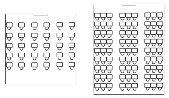 我们需要了解两种尺寸,一是教室尺寸,二是显示尺寸。经调研,我国中小学教室面积在30平方米-63平方米之间,教室以正方形(Square)和长方形(Deep)为主,教室长宽从5米×6米-9米×7米不等,桌椅排布从5排6列到9排9列不等。如下图所示: