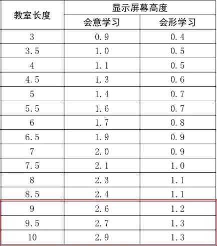 前面我们通过了解教室尺寸知道,9米是很常用的教室长度尺寸,那么根据上表红框处,显示画面的安全高度是1.2米-1.3米,经过简单换算,对应的显示尺寸是89-96英寸。