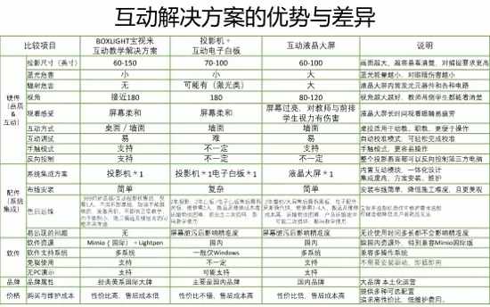 教室中显示设备的交互性是强制需求,关于设备的交互解决方案,目前市场上的主流解决方案分为投影机+电子白板、互动投影机、触控液晶大屏这三大类,我们用一张表来汇总这三个方案的优劣如下: