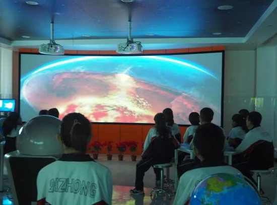 羿飞环幕示教系统位于教室后方,专用于地理视频资源的播放。巨大的屏幕带来震撼的视觉冲击,直观地展示事物发展的动态过程,让课程内容变得更生动有趣。视频课件对课程的导入、过渡作用,使课程进行得更自然顺畅。