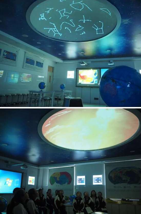 天文演示仪在天花板上投影出一个圆形的演示穹顶。将学生的视角由地球范畴,转向太空乃至整个宇宙,将地理知识与天文教学有效整合,使学生了解地月系、地球与太阳系、地球与银河系之间的关系,了解恒星、行星的形成及宇宙的演变过程。