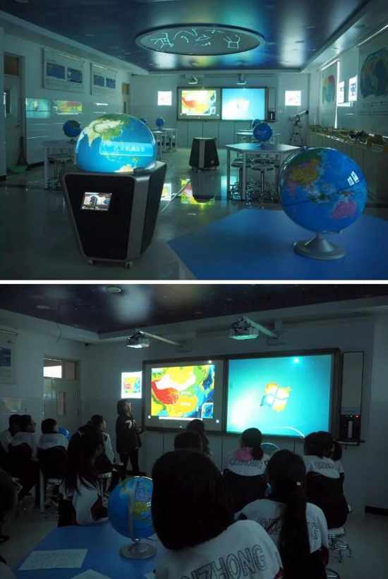 位于教室前方的数字立体地形,专门针对地理学科特点研发,将三维地形模型和虚拟数字影像相结合,教师可轻松切换中国、世界立体地形、教学PPT、Flash动画等不同模式,满足各种教学所需。课件内容紧密贴合教学大纲,并能不断地编写与更新,无限扩充理教学内容,给任课教师带来更大的自主性。