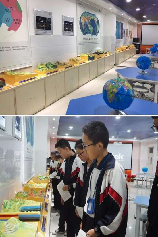 课后对知识的及时巩固也至关重要,对于学生来说,背得再多,也不如亲自动手模拟实验来得印象深刻。教室四周陈列着十八种地形地貌模型,如板块构造及地表形态模型、褶皱构造及地貌演变模型、岛屿成因演示模型、丹霞地貌、地下水模型等,制作精良,帮助学生加深对知识点的理解。