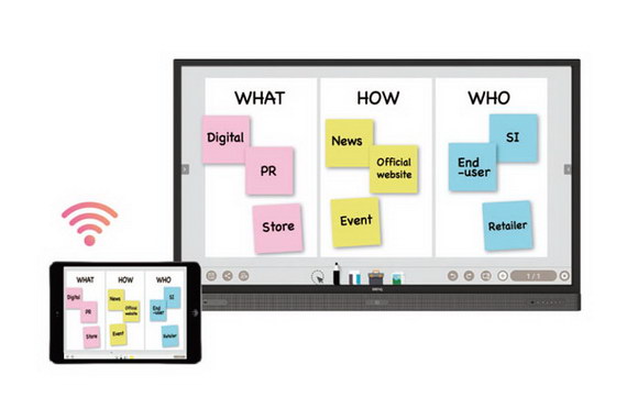 BenQ InstaQShare 纯软件方案无线传屏功能,便利师生间的协作分享,当老师请同学分享作业时,遵循BYOD自带设备学习法,学生可通过笔记本电脑或平板电脑,快速将自己的作品投屏到互动白板进行分享,提升学生的课堂参与度。